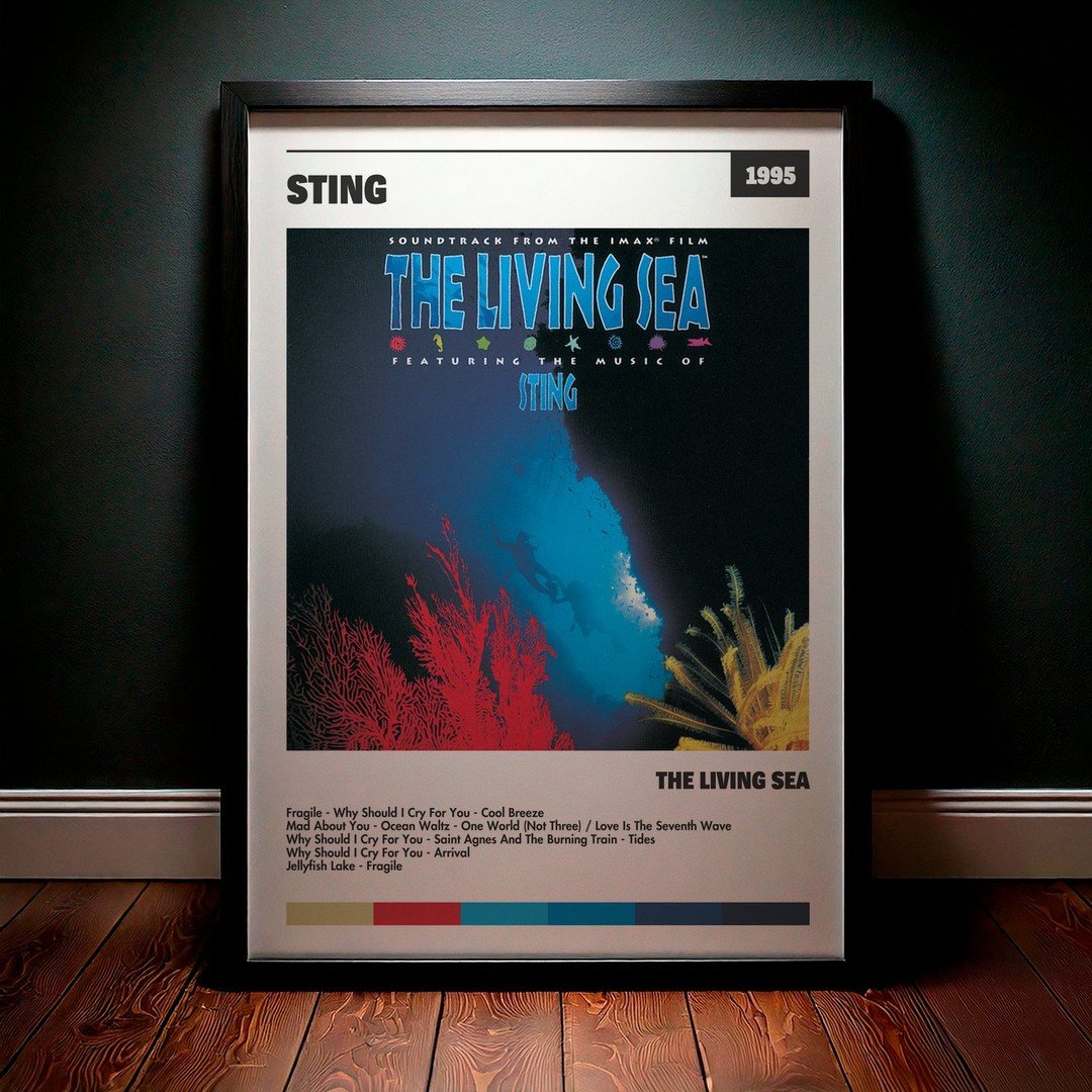 Nuestra colección de cuadros de Sting captura la esencia de sus álbumes más icónicos, presentados en un elegante estilo, en este caso te presentamos el de su disco The Living Sea.