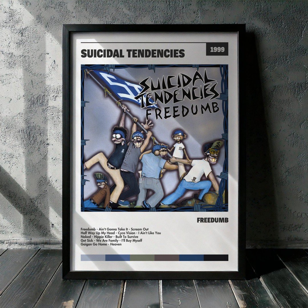 Nuestra colección de cuadros de Suicidal Tendencies captura la esencia de sus álbumes más icónicos, presentados en un elegante estilo, en este caso te presentamos el de su disco Freedumb.
