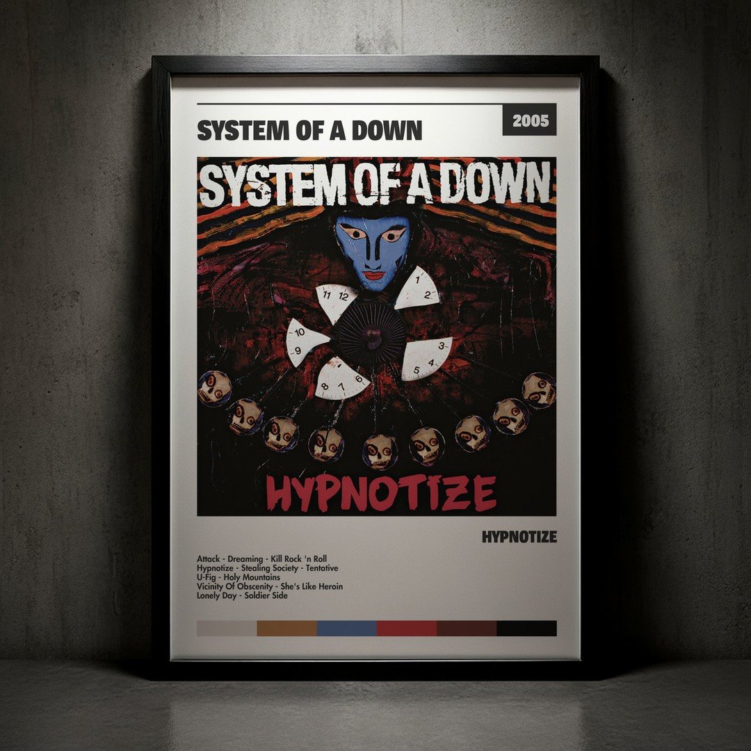 Nuestra colección de cuadros de System Of A Down captura la esencia de sus álbumes más icónicos, presentados en un elegante estilo, en este caso te presentamos el de su disco Hypnotize.