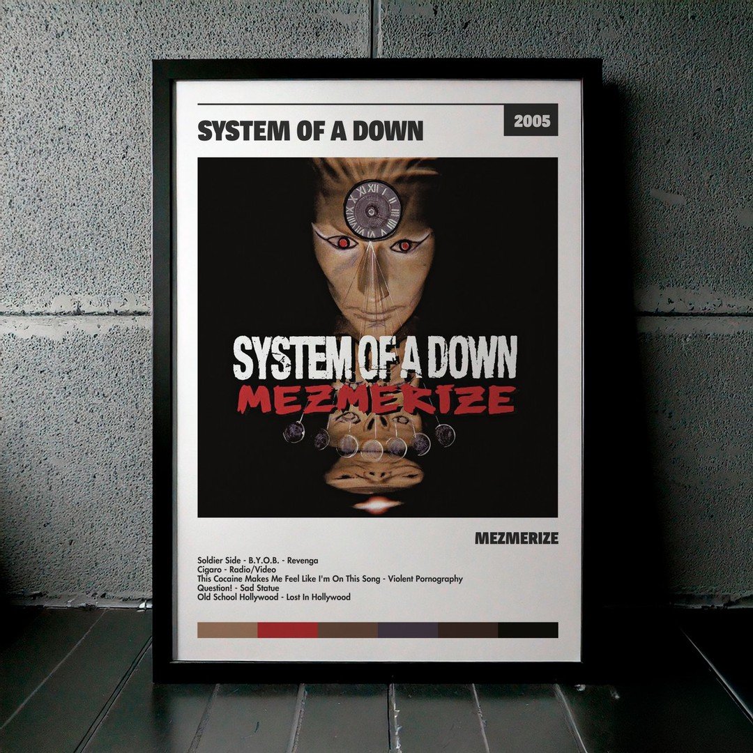 Nuestra colección de cuadros de System Of A Down captura la esencia de sus álbumes más icónicos, presentados en un elegante estilo, en este caso te presentamos el de su disco Mezmerize.