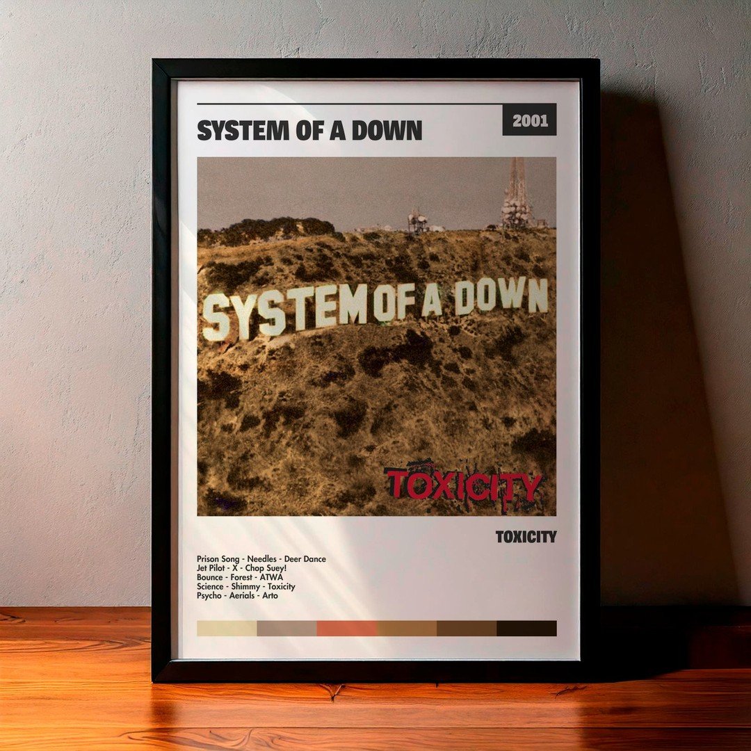 Nuestra colección de cuadros de System Of A Down captura la esencia de sus álbumes más icónicos, presentados en un elegante estilo, en este caso te presentamos el de su disco Toxicity.