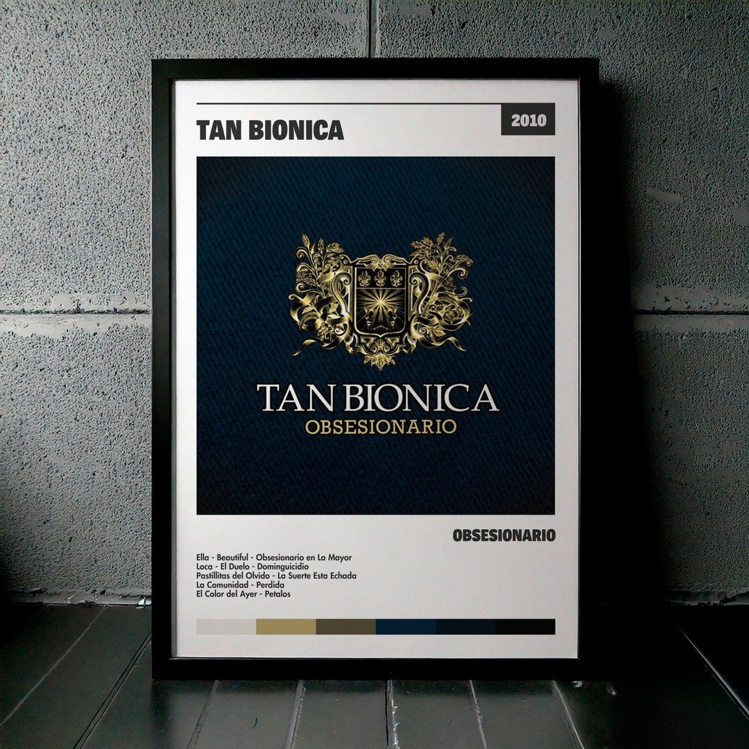 Nuestra colección de cuadros de Tan Bionica captura la esencia de sus álbumes más icónicos, presentados en un elegante estilo, en este caso te presentamos el de su disco Obsesionario.