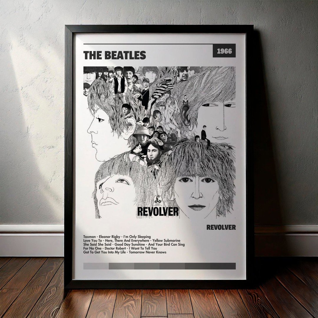 Nuestra colección de cuadros de The Beatles captura la esencia de sus álbumes más icónicos, presentados en un elegante estilo, en este caso te presentamos el de su disco Revolver.