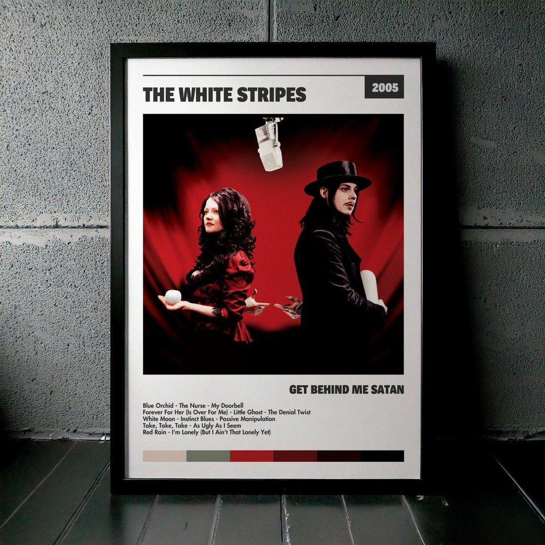 Nuestra colección de cuadros de The White Stripes captura la esencia de sus álbumes más icónicos, presentados en un elegante estilo, en este caso te presentamos el de su disco Get Behind Me Satan.