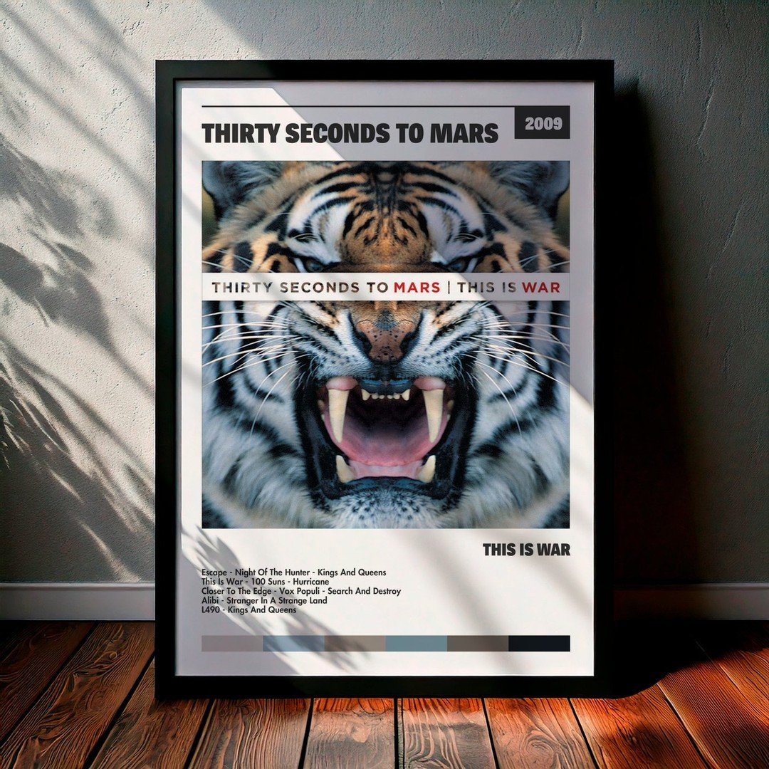 Nuestra colección de cuadros de Thirty Seconds To Mars captura la esencia de sus álbumes más icónicos, presentados en un elegante estilo, en este caso te presentamos el de su disco This Is War.