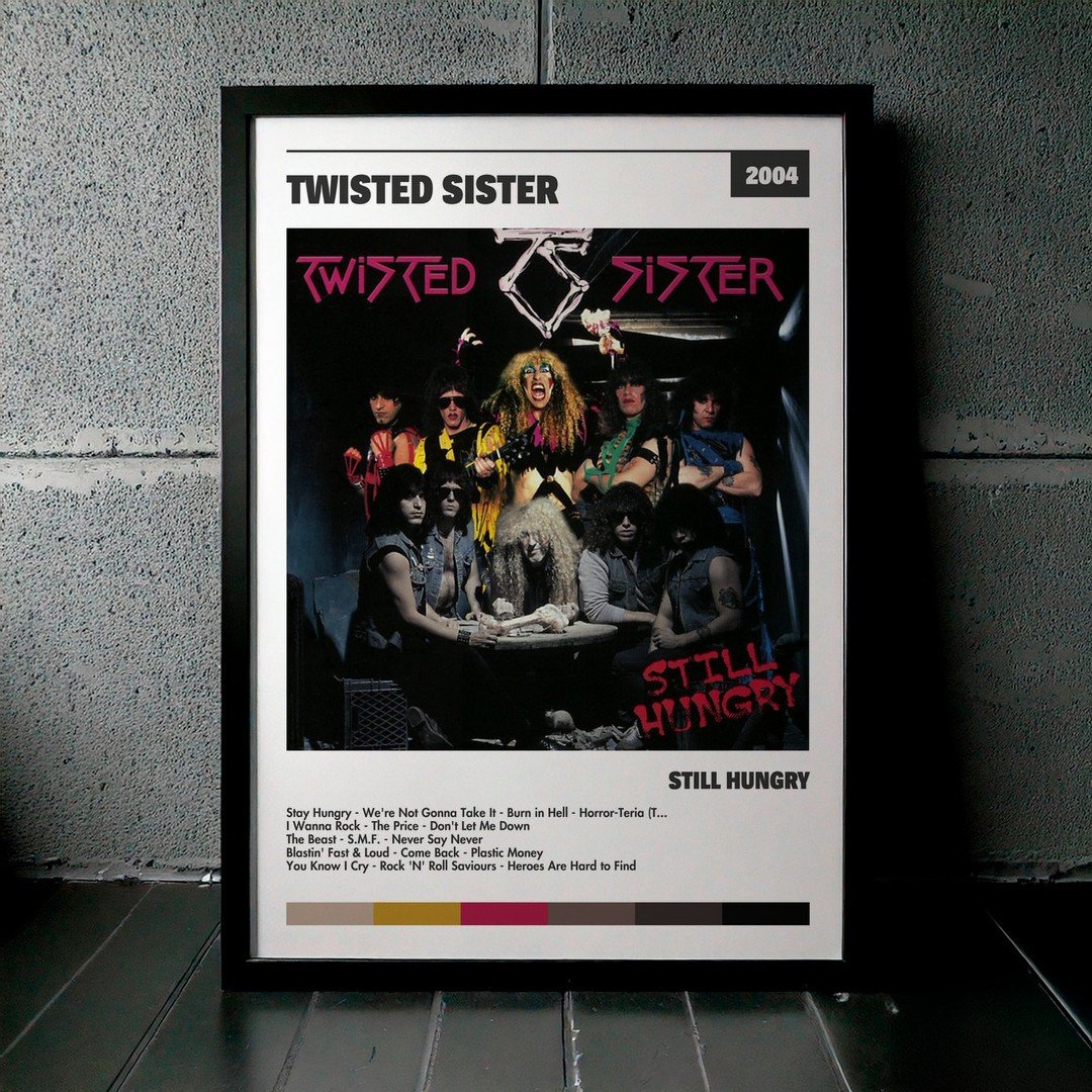 Nuestra colección de cuadros de Twisted Sister captura la esencia de sus álbumes más icónicos, presentados en un elegante estilo, en este caso te presentamos el de su disco Still Hungry.