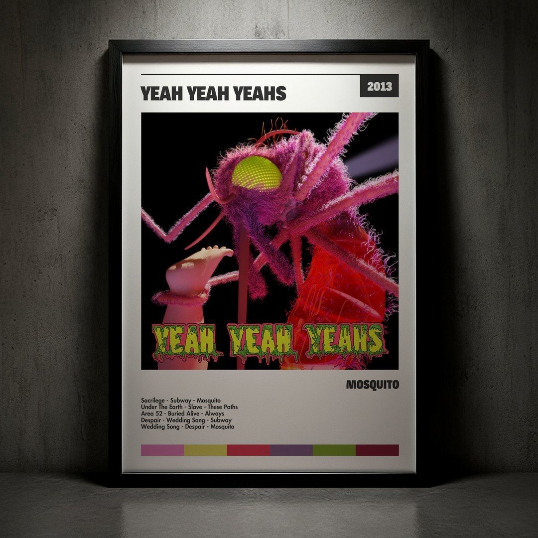 Nuestra colección de cuadros de Yeah Yeah Yeahs captura la esencia de sus álbumes más icónicos, presentados en un elegante estilo, en este caso te presentamos el de su disco Mosquito.